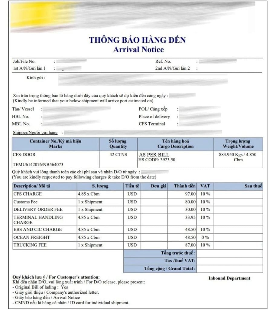 4. Nội dung chính có trong Arrival Notice