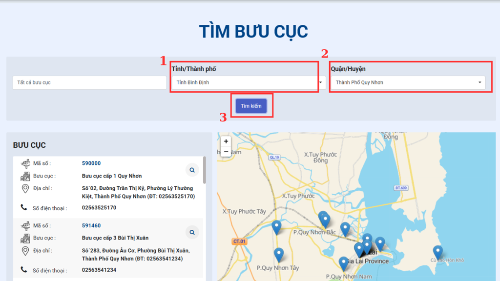 5 | 593330 | Bưu cục cấp 3 Tam Quan | Khối 5, Thị Trấn Tam Quan, Huyện Hoài Nhơn | Hoài Nhơn | Phường Tam Quan | 2563865869 |