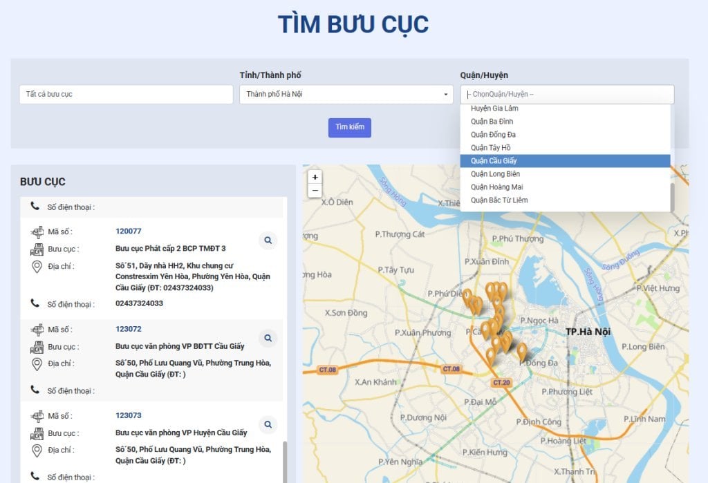 Chẳng hạn để tìm bưu điện Cầu Giấy, bạn chỉ cần truy cập website VNPost, chọn “Hà Nội” và những Quận/ Huyện tương ứng sẽ xuất hiện để bạn lựa chọn.