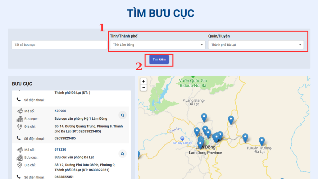 21 | 671230 | Bưu cục văn phòng Đà Lạt | Số 12, Đường Phó Đức Chính, Phường 9, Thành phố Đà Lạt | Đà Lạt | Lâm Viên | 633822351 |