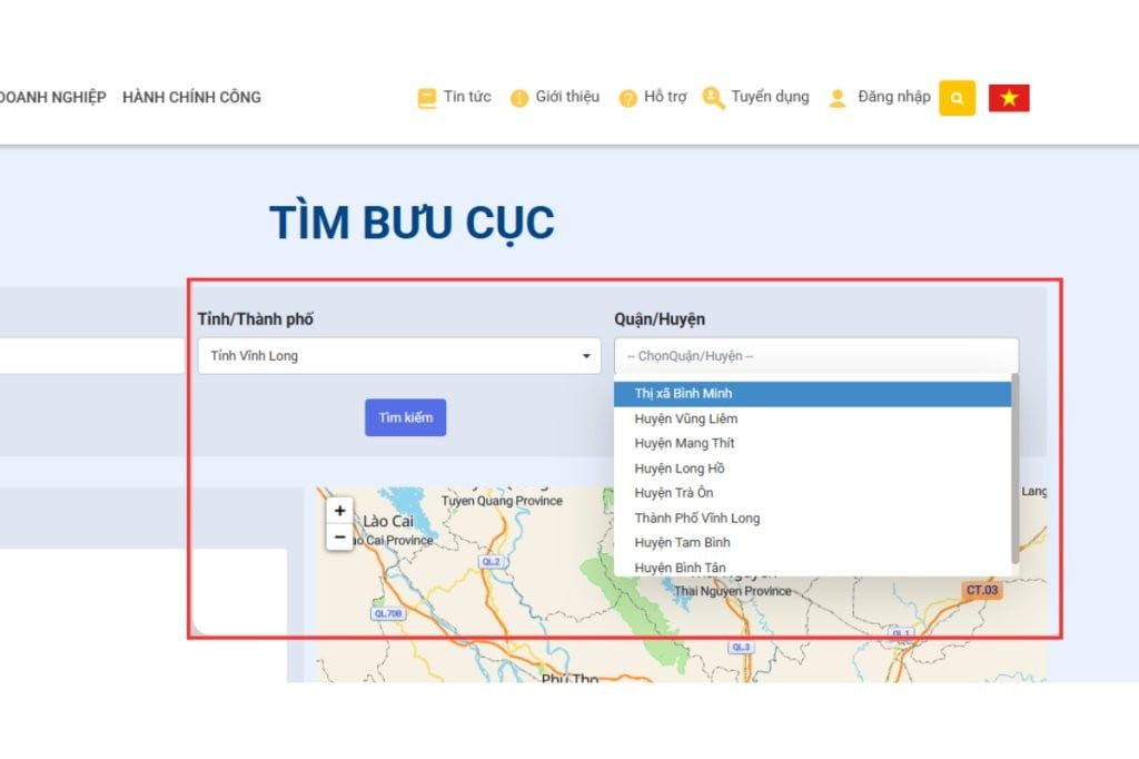 - Bước 3: Nhập thông tin tìm kiếm bằng cách chọn "Tỉnh/Thành phố" là Vĩnh Long và tiếp tục chọn "Quận/Huyện" tương ứng.