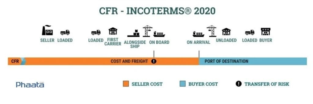 Với CFR, người bán chịu trách nhiệm giao hàng lên tàu và trả cước phí vận chuyển đến cảng đích. Tuy nhiên, người bán không phải mua bảo hiểm cho lô hàng. Lúc này, rủi ro được chuyển giao cho người mua ngay khi hàng hóa được xếp lên tàu tại cảng đi. Lưu ý rằng điều kiện CFR chỉ áp dụng cho vận tải đường biển và đường thủy nội địa.