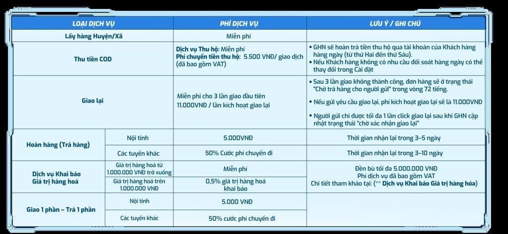 Bên cạnh đó, GHN công khai bảng giá dịch vụ đi kèm công khai như sau: