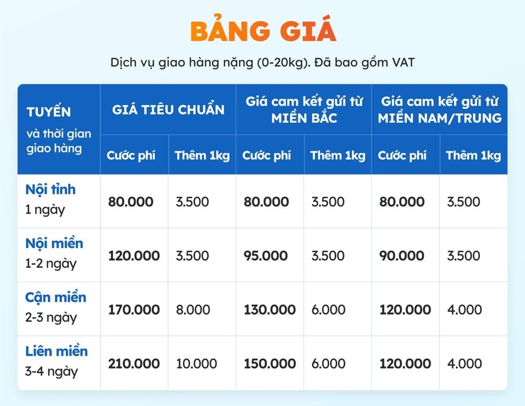 Đối với hàng hóa nặng và cồng kềnh, Giao Hàng Nhanh áp dụng mức giá khác nhau tùy theo điểm xuất phát. Cụ thể, giá gửi từ Hải Phòng là 150.000 VND và từ Sài Gòn là 120.000 VND. Đặc biệt, đơn vị cũng có chính sách ưu đãi hấp dẫn dành cho các shop có lượng hàng lớn cùng nhiều hỗ trợ thiết thực.