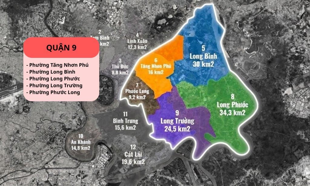 Bản đồ các phường quận 9 sau sáp nhập cùng TP. Thủ Đức.