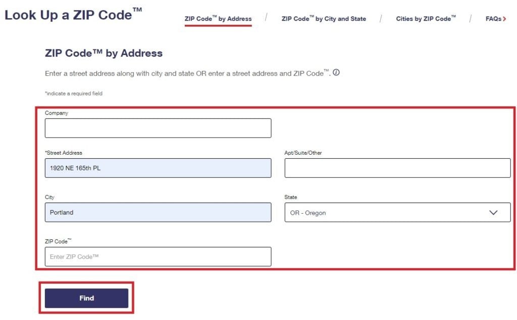 - Bước 4: Kiểm tra thông tin nhận hàng rồi bấm ‘find’ (tìm kiếm). Lúc này giao diện có thể hiển thị mã vùng Hoa Kỳ 5 số hoặc ZIP+4 (nếu có).