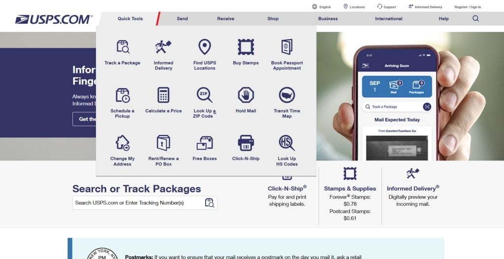 - Bước 1: Tại giao diện chính tools.usps.com, chủ shop lướt chuột đến vị trí Quick Tools trên thanh công cụ. Sau đó chọn lệnh ZIP Code™ Lookup.