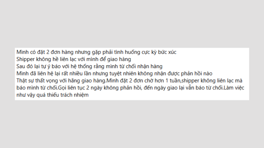 Một số khách phản ánh chưa được shipper liên hệ nhưng ứng dụng mua hàng đã hiển thị “hoàn thành” hoặc “hoàn hàng vì người mua không nhận”. Có thể lý giải tình trạng này theo hướng shipper đã liên lạc nhưng khách không bắt máy. Hoặc cũng có khả năng nhân viên trễ đơn vì phải giao quá nhiều hàng cùng lúc nên bấm hoàn hàng.