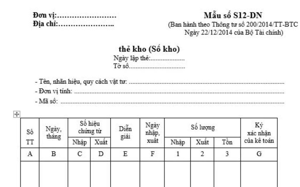 Mẫu thẻ kho theo thông tư 200/2014/TT-BTC là mẫu số S12-DN dành cho các doanh nghiệp vừa và lớn theo chế độ kế toán doanh nghiệp mới.