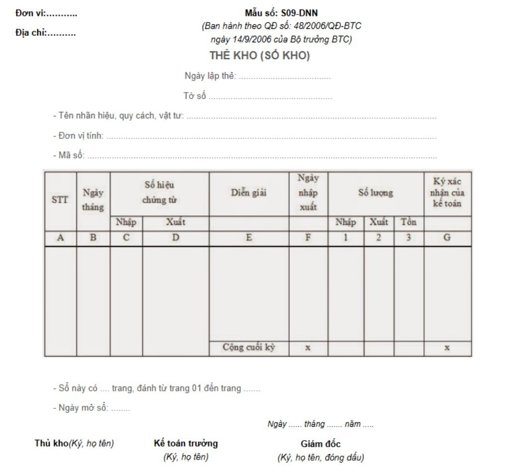 Thẻ kho theo Quyết định 48/2006/QĐ-BTC là mẫu số S09-DNN dành cho doanh nghiệp nhỏ và vừa.