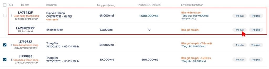 - Bước 3: Tìm đơn hàng phù hợp trong danh sách và nhấn “Tra cứu” để mở trang chi tiết.