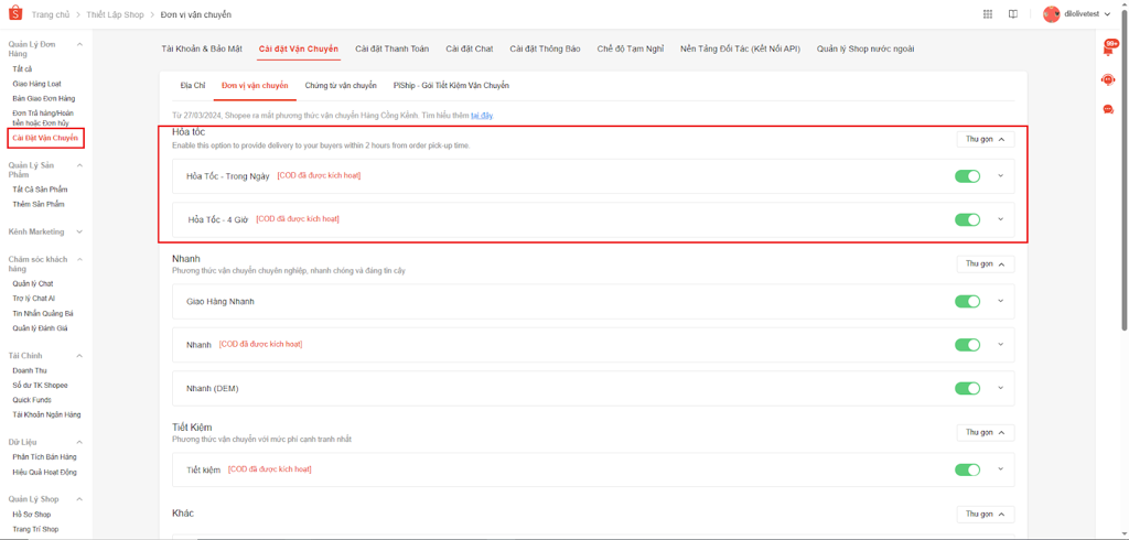 - Bước 3: Gạt nút sang phải để bật các phương thức vận chuyển Shopee mà bạn muốn sử dụng. Sau khi bật, người mua sẽ có thể lựa chọn các đơn vị này khi đặt hàng từ shop của bạn.
