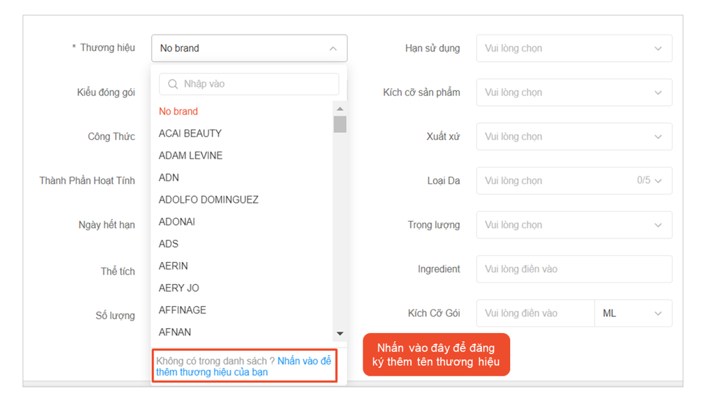 Nếu ở bước điền thông tin sản phẩm không có tên thương hiệu hàng hóa shop nhập về hoặc do chính shop bán thì có thể thêm bằng nút Nhấn vào để thêm thương hiệu của bạn.