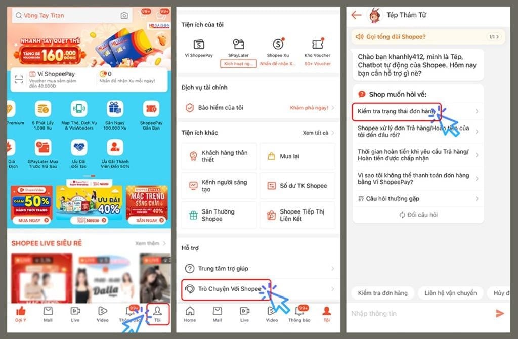 Tép thám tử là hệ thống chat tự động của Shopee, giúp hỗ trợ người dùng tra cứu thông tin cơ bản về đơn hàng, đơn vị vận chuyển, thanh toán, hàng hóa,... Để nhắn tin với Tép thám tử, bạn có thể thực hiện thao tác sau: