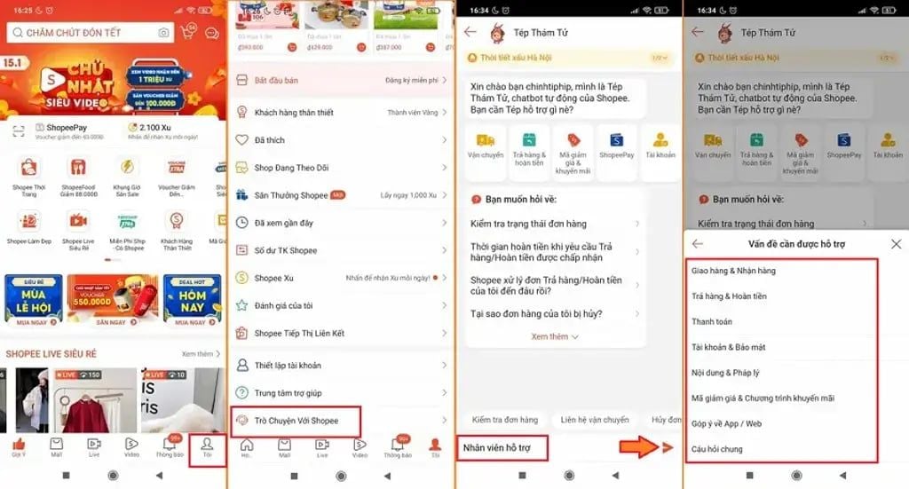 Với những bạn mới sử dụng Shopee thì các vấn đề trên thường hay gặp phải. Lúc này, bạn hãy liên hệ nhân viên Shopee bằng cách gọi Bộ phận Chăm sóc khách hàng, nhắn tin với Tép thám tử hoặc chat với Nhân viên hỗ trợ.