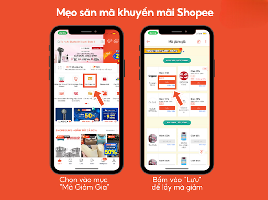 Bạn chọn vào mục ‘Mã giảm giá’ > bấm ‘Lưu’ hoặc ‘Lấy mã’ để sử dụng các mã giảm giá Shopee.