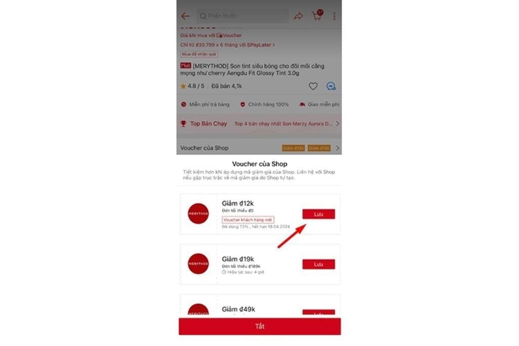 Tìm sản phẩm cần mua > chọn mục ‘Voucher của Shop’ > nhấn nút ‘Lưu’ các mã giảm giá hiển thị trên màn hình.
