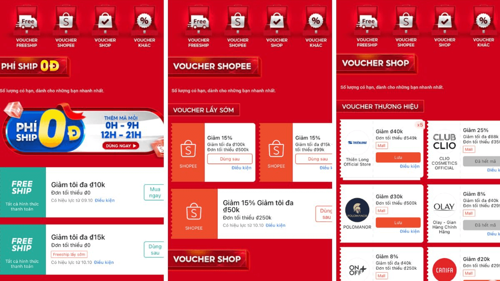- 9h, 12h, 15h, 18h, 21h: Tương tự ngày thường nhưng số lượng và giá trị voucher sẽ nhiều hơn. Ngoài ra còn có voucher riêng của từng thương hiệu và voucher độc quyền của Shopee.