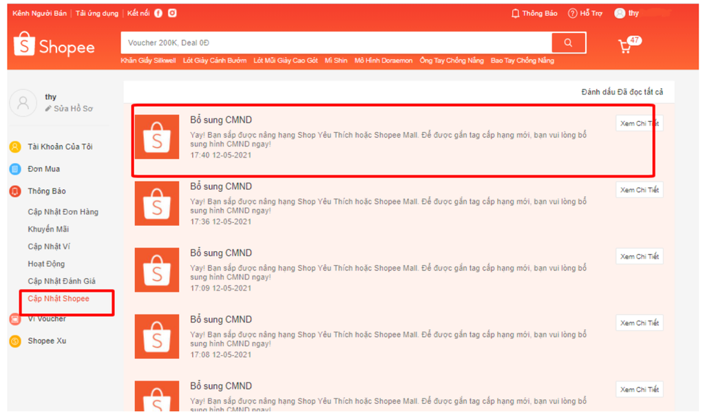- Có thể kiểm tra chứng từ đã hợp lệ chưa ở mục Thông báo: Sau khi tải lên, bạn có thể vào Kênh Người Bán để theo dõi trạng thái xác thực chứng từ của mình.