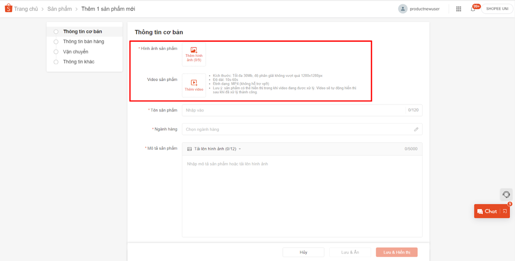 Các Shop sẽ tải hình ảnh/video sản phẩm lên, sau đó điền vào phần mô tả sản phẩm bên dưới.