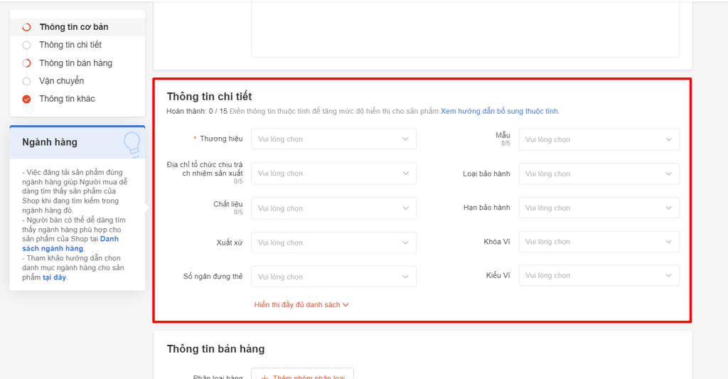 Các chủ shop cần điền đầy đủ thông tin tại các mục có đánh dấu hoa thị (*). Ngoài ra, shop có thể điền thêm các thông tin như mẫu sản phẩm, chất liệu, ngày sản xuất,...