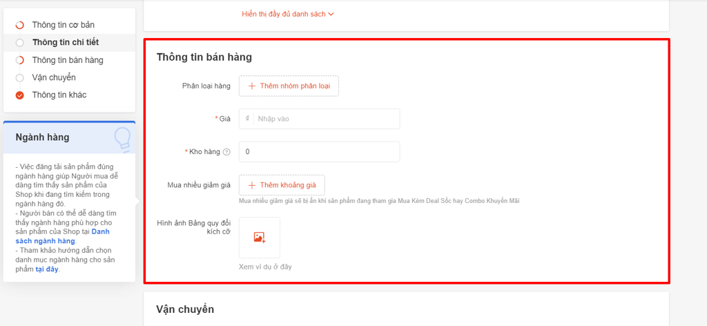 Người bán cần điền các thông tin như phân loại hàng, giá, kho hàng, chương trình ưu đãi mua nhiều giảm giá (nếu có), hình ảnh bảng quy đổi kích cỡ.