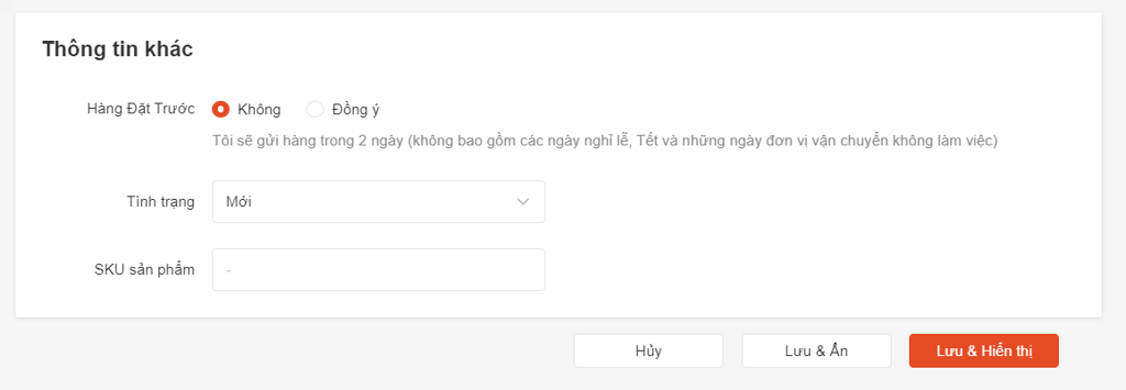 Một bước không thể thiếu ở cách đăng bán hàng Shopee là người bán hãy điền thông tin như tình trạng sản phẩm, sản phẩm cần đặt trước tùy thuộc vào hàng hóa của shop. Điều này giúp khách hàng dễ dàng mua hàng. Sau khi đã hoàn tất hết thông tin, các shop bấm lưu là đã hoàn thành các cách đăng bán hàng trên Shopee.