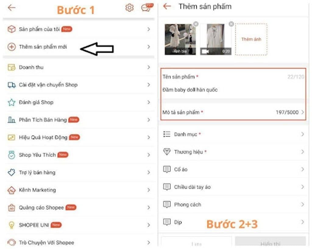 Sau khi chọn thêm sản phẩm, shop điền các thông tin đánh dấu hoa thị (*) và thêm hình sản phẩm ở bước 2 và 3.