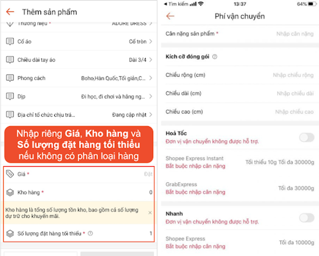 Giá và kho hàng là hai mục bắt buộc các shop điền đầy đủ trong bước này.