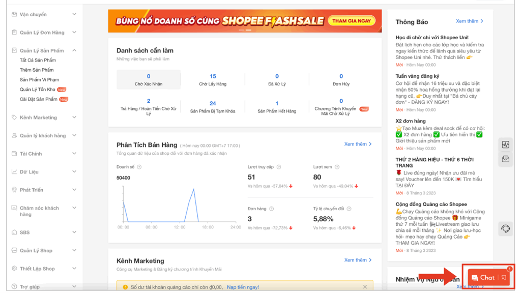 Biểu tượng Chat màu cam ở góc dưới màn hình là nơi shop có thể liên hệ Shopee hỗ trợ.
