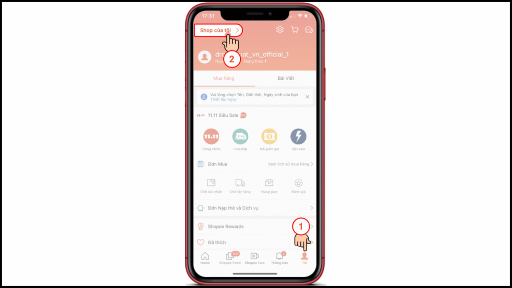 - Bước 1: Mở ứng dụng Shopee và truy cập vào mục Tôi, sau đó chọn Shop của tôi.