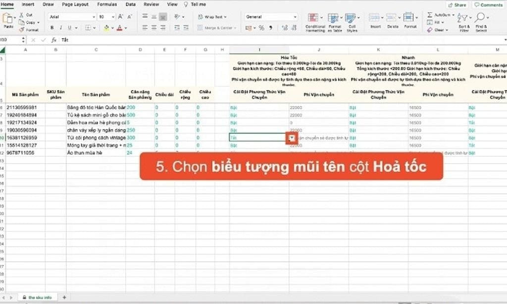 - Bước 5: Tại cột ‘Hỏa tốc’, bạn chọn biểu tượng mũi tên và tiến hành cài đặt ‘Phương thức vận chuyển’ rồi chọn ‘Bật’. Sau đó lưu lại file đã chỉnh sửa.